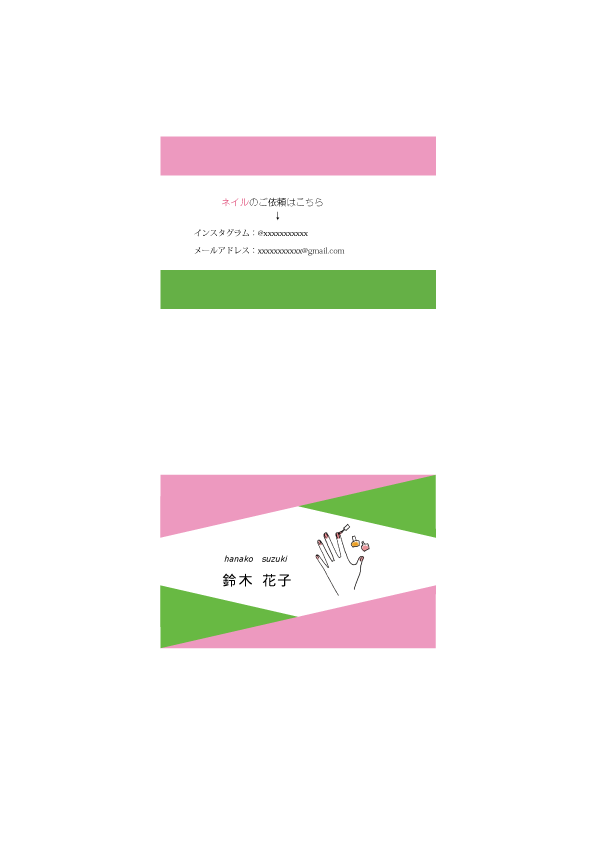 通っているスクールのネイル講座の受講生さんからの依頼で作成した名刺です。派手な色ではなくかわいらしい感じでというご要望でしたので、純色ではなく、ピンクと緑のパステルカラーにしました。また、名前の漢字に女性らしく丸いフォントを採用しました。三角形を組み合わせてスタイリッシュな感じにもしました。裏面もピンクと緑で表面とリンクする感じにしました。※名前、アドレス等の個人情報は変更して公開しております。