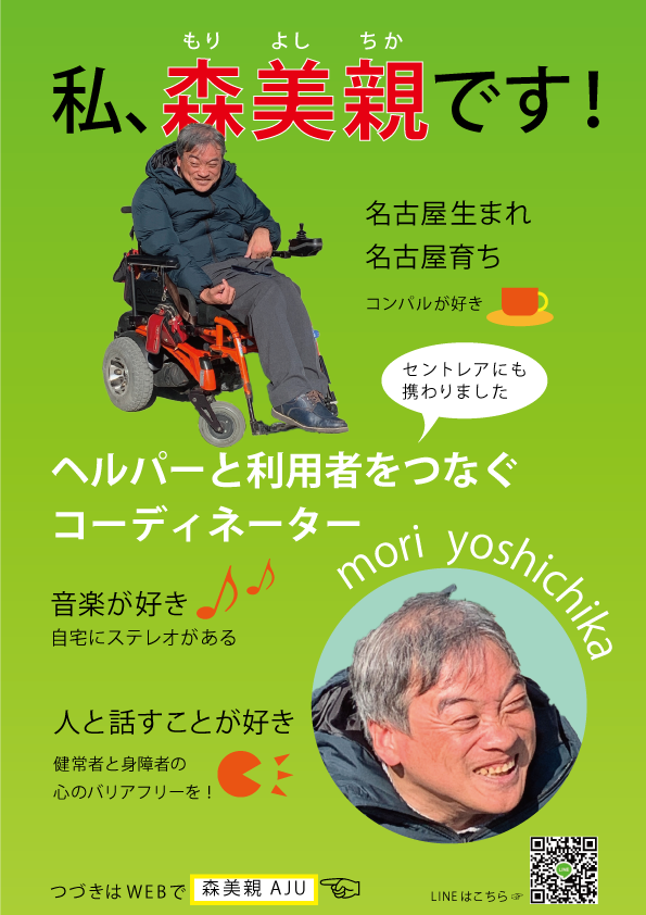 一つ前の作品の裏面。表面で興味をもってもらい、裏面に森さんの情報を載せることでさらなる興味をもってもらうことが狙いです。最終的な目的はWEBで検索してもらったり、LINEでつながってもらって障害者についてより理解を深めてもらうこと。森の人柄がわかるにこやかな表情の写真やアイコンを配置して親しみやすい感じを出しました。グリーンをテーマカラーにしたのは森さんの好きな色だということと木々の森をイメージして決めました。